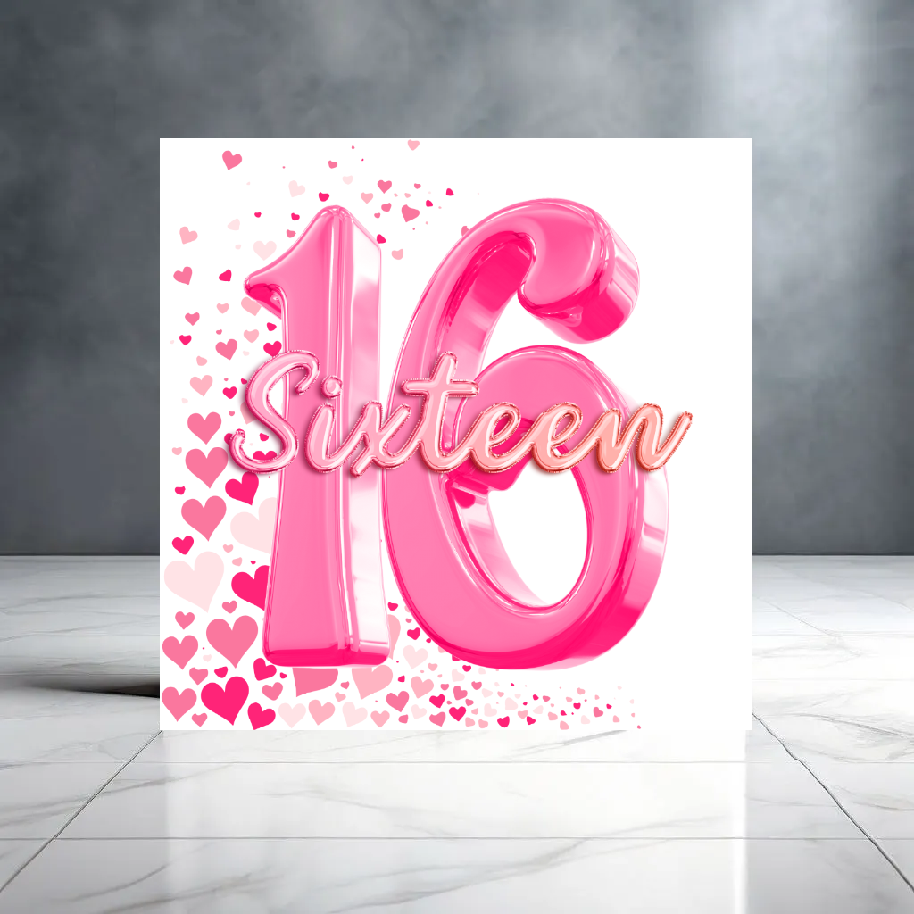 Pink 16th Birthday Card with Balloons and Hearts - Sweet Sixteen.